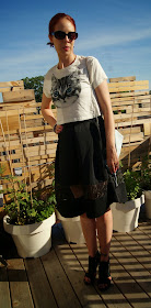 The waist of this full skirt from Express sits at my natural waist line, which is above my belly bump. And because it is very full, the skirt billows out from my waist and no one can tell I need to lose a few inches. The sheer panel that wraps around the sophisticated looking skirt gives it an interesting and chic detail. The cute cat crop top, I got last summer from Forever 21, brought in a fun element to this look. And the purse I got at a clearance sale from H&M for only $5! I love those clearance sales, you can sometimes find some really cool pieces for dirt cheap. And to bring in a sexy element, I'm wearing my new favourite heels from Forever 21. I love how all the different elements came together to create a fabulous outfit!: the chic and sophisticated skirt, the fun and cute crop top, and the edgy and sexy shoes.
